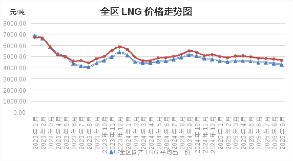 9月份,全区国产LNG平均出厂价格、LNG平均零售价格分别为每吨4281.50元、4653.82元。环比价格分别下降2.01%、2.37%,同比价格分别下降16.47%、15.31%。