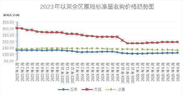 2025年9月份,全区小麦收购价格略降,玉米收购价格略涨,大豆收购价格稳定;与去年同期相比,小麦、玉米、大豆收购价格均延续下降趋势。