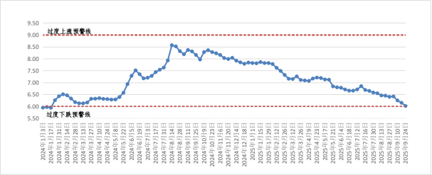 1-9月份,我区猪粮比价在合理区间小幅波动下行。1月份,我区生猪出场价格和玉米价格均小幅下降,猪粮比价稳定在7.80︰1附近微幅波动;2-9月份,生猪出场价格波动下降、玉米价格低位小幅回升,猪粮比价波动下行,截至9月24日,全区猪粮比价为6.02:1,接近6:1的过度下跌三级预警临界值。