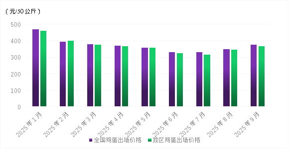 1-9月份,我区鸡蛋出场价格先降后升。今年以来,国内蛋鸡存栏持续高位,养殖端在成本可控以及对秋季鸡蛋行情预期回暖等影响下淘汰意愿偏弱,鸡蛋市场存在一定供应压力。相比之下,鸡蛋市场需求增长相对有限。其中,1月份在“元旦”、“春节”等节日效应提振下,鸡蛋市场需求集中释放;2-3月份,食品加工企业减少对鸡蛋的采购量,且居民家庭以消化存货为主。4-5月份,随着气温逐步回升及“五一”“端午”节日临近,鸡蛋市场需求小幅回升;6-7月份,节日提振效应消退,鸡蛋市场需求回归常态。8-9月份,先后在学校开学、节前备货等提振下,鸡蛋市场需求走强。在供需、成本等因素作用下,1-7月份我区鸡蛋出场价格呈逐步下降走势;8-9月份价格触底反弹,养殖端盈利状况好转。9月份我区鸡蛋平均出场价格为366.66元/50公斤,与2024年12月份相比累计下降22.07%。