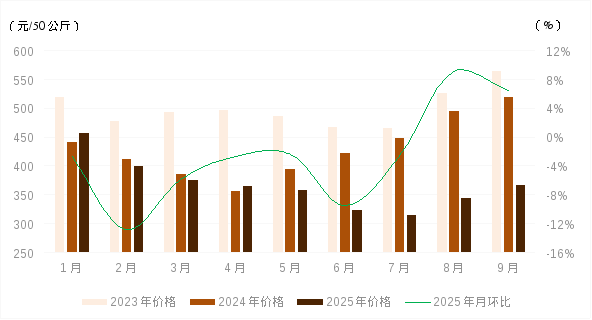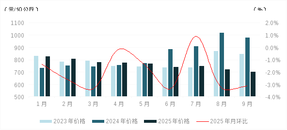 1-9月份,我区生猪出场价格小幅波动下降。一方面,2024年能繁母猪存栏量的变化逐渐传导到2025年生猪出栏量上,前三季度生猪产能逐步释放;同时,今年玉米、豆粕等饲料成本偏低,加上规模化、集约化养殖模式下生产效率不断提升,中大猪出栏较为稳定,生猪市场供应充裕。另一方面,前三季度生猪市场需求季节性变化。1-3月份,先后在“元旦”、“春节”,以及学校开学等因素提振下,猪肉消费需求较为旺盛;4-8月份,随着气温逐渐回升,消费者饮食结构趋于清淡,猪肉消费需求转弱;同时,鸡蛋价格低位运行也对猪肉形成一定替代。9月份,随着高温天气结束,以及各地大中院校集中开学提振猪肉集团消费量,猪肉需求小幅提升。在供应充足、成本偏低的背景下,1-9月份我区生猪出场价格波动下降。9月份我区生猪平均出场价格为702.32元/50公斤,与2024年12月份相比累计下降16.44%。