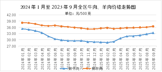 1-9月份,我区牛羊肉市场供应压力有所缓解,价格以涨为主。牛肉、去骨羊肉9月份全区平均零售价格分别为每50033.30元、36.41元,与年初相比,牛肉、去骨羊肉价格分别上涨15.50%2.68%
