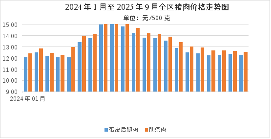 1-9月份,我区猪肉价格以降为主。据农业农村部数据显示,上半年全国生猪市场供应相对充足,尽管春节、端午等节日对下游市场有所提振,但力度有限。9月份猪带皮后腿肉、猪肋条肉全区平均价格分别为每50012.28元、12.56元,与年初相比,猪带皮后腿肉、猪肋条肉价格分别下降10.89%11.42%