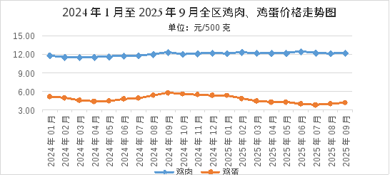 前三季度,鸡蛋、鸡肉全区平均价格分别为每5004.36元、12.20元,同比,鸡肉价格上涨3.92%,鸡蛋价格下降11.56%