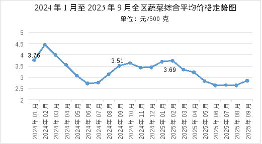 1-9月份,全区蔬菜价格波动运行。1-2月份,受天气寒冷导致蔬菜生产、运输成本较高,以及春节节日效应拉动等因素影响,我区蔬菜价格持续上涨,2月份为季节性高点,全区蔬菜综合平均零售价格为3.73/500克。3-6月份,随着天气转暖我区蔬菜市场供应量及品种逐步增加,露地菜逐渐取代暖棚菜,本地菜逐渐取代外调菜,且蔬菜生产、运输费用不断下降,我区监测的15种蔬菜价格普遍回落。7月份受高温多雨水因素影响,我区蔬菜价格环比略升。8月份蔬菜价格回归下行通道。9月份,受中秋国庆节日效应拉动,我区蔬菜价格进入上涨通道。9月份,全区蔬菜综合平均价为2.84/500克,与年初相比,下降23.04%。前三季度,15种蔬菜全区综合平均价格为3.07/500克,同比下降10.76%