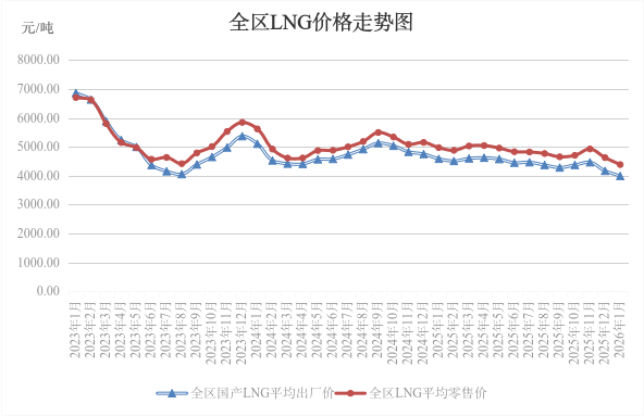1月份,全区国产LNG(液化天然气,下同)平均出厂价格、LNG平均零售价格分别为每吨3991.00元、4312.50元,环比分别下降4.20%、5.20%,同比分别下降12.94%、11.80%。