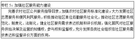 ——大力发展社区志愿服务和便民利民服务。培育发展社区服务业,鼓励和支持各类组织、企业和个人兴办以家庭服务业为主的社区服务业,完善社区便民利民服务网络,优化社区商业结构布局,基本建立规划合理、结构均衡、竞争有序的社区便民利民服务体系。积极推动驻区单位后勤服务社会化。建立社区管理和物业管理联动机制,提高物业服务质量。明确居民自我服务的内容,进一步激发居民自我服务的意识,提升服务能力和水平。