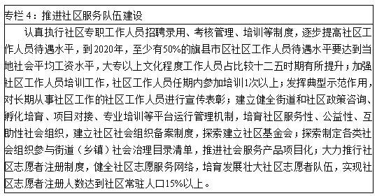 ——完善社区工作者队伍建设机制。改善社区服务人员结构,扩大来源渠道,提高社区工作者服务人才队伍职业化、专业化水平,提升公共服务意识和工作积极性。继续推进社区工作人员队伍建设,认真执行社区专职工作人员招聘录用、考核管理、培训等制度。加大力度,逐步提高社区工作人员待遇水平,落实社区工作人员报酬待遇,到2020年,争取50%的旗县(市、区)社区工作人员报酬待遇达到当地社会平均工资水平。加强社区工作人员培训工作,社区工作人员任期内参加培训1次以上;完善社区工作人员的激励机制,发挥典型示范作用,对长期从事社区工作的社区工作人员进行宣传表彰,探索建立从中培养发展党员,选拔基层干部,推荐党代表、人大代表、政协委员和劳动模范等制度渠道,激发社区工作人员工作积极性,提升工作热情。