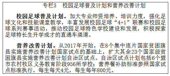 ——教育综合改革有序推进。制定《内蒙古自治区深化教育领域综合改革实施方案》,全面推进《自治区深化考试招生制度改革实施方案》《校园足球工作三年推进计划》《关于做好新时期教育对外开放工作的实施意见》等一系列改革文件的落地生效。职业教育分类考试稳步推进,高职院校通过非统一高考方式录取学生比例基本接近一半。深化校园足球改革,国家级、自治区级足球特色校覆盖了全区50%以上的中小学,形成了具有我区特色的“四级两段”校园赛事体系。积极打造“留学内蒙古”品牌,中外合作办学项目及参与项目人数、留学生人数、公派留学人员数等明显增长,内蒙古大学在俄罗斯卡尔梅克国立大学设立孔子学院。