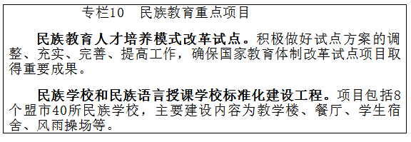 加快发展民族教育。全面落实《内蒙古自治区民族教育条例》,统筹各项教育工程向民族教育倾斜,率先实现民族中小学校标准化,普及民族学前教育和高中阶段教育。继续推进民族教育人才培养模式改革试点和少数民族高层次骨干人才培养工作。组织实施民族学校和民族语言授课学校标准化建设工程、蒙汉双语授课义务教育阶段学校理科教学质量提升计划。