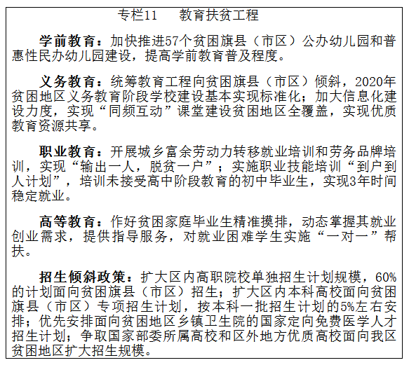 全面推进教育精准扶贫。对接农村牧区贫困人口建档立卡数据库,提高教育扶贫精准度,以提高贫困地区人口科学文化素质和劳动者基本技术技能为抓手,促进教育扶智、技能立业、就业脱贫、创业致富。继续实施高校招生倾斜ld体育中国官方网站,逐步扩大自治区重点高校对招收边远、贫困、民族地区优秀农村牧区学生的定向招生比例。完善贫困学生及其贫困家庭的就学就业资助服务体系,保障贫困学生顺利完成学业,顺利就业。