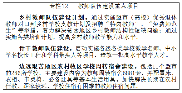 夯实教育脱贫根基。统筹实施各项教育工程,改善贫困地区办学条件,加快提升发展水平,实现建档立卡等贫困人口教育基本公共服务全覆盖。实施盟市(高校)优秀退休教师对口返聘到乡村学校支教计划及招聘“特岗教师”、“免费师范生”等举措,提升贫困地区乡村教师整体素质。
