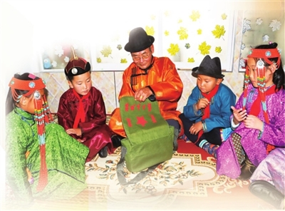 苏尼特右旗桑宝拉格苏木巴彦乌拉嘎查老党员为青少年讲述“红书包”送学服务故事。