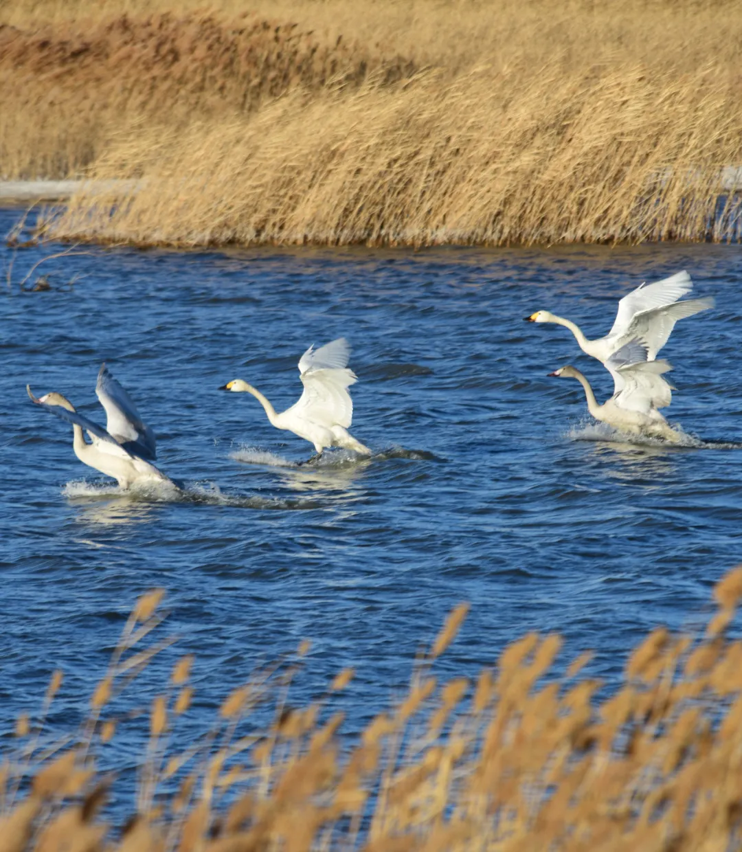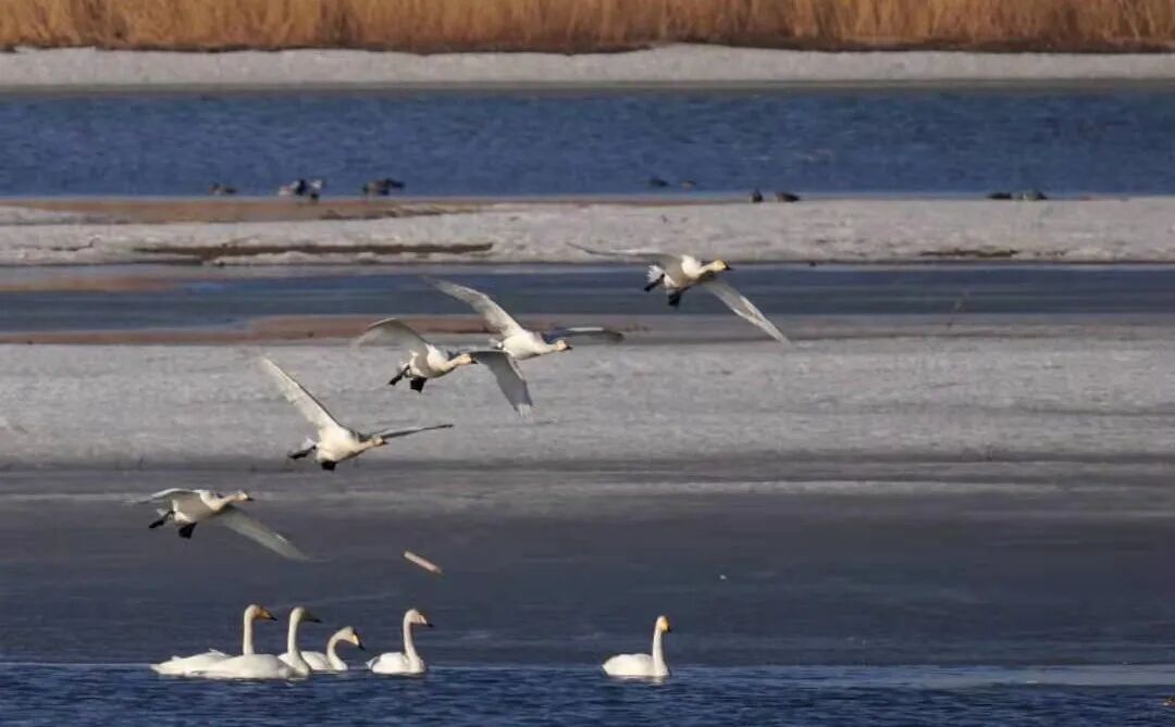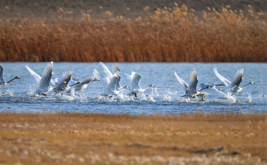 沿着黄河三盛公水利枢纽库区上游,这里是天鹅的重要栖息地。波光粼粼的河面上,数百只天鹅引颈长鸣、展翅滑翔的景象尤为壮观。