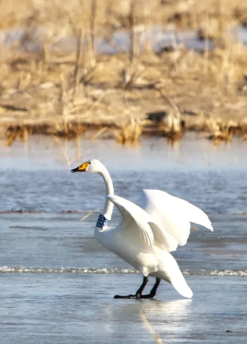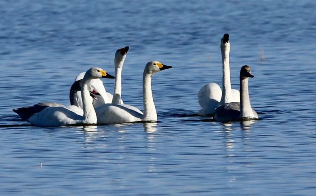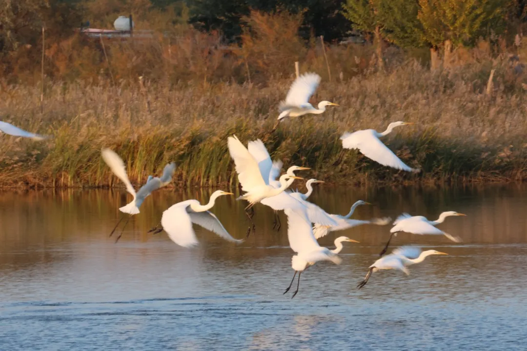 大批白天鹅成群结队在水面优雅游弋,此外还有赤麻鸭、白鹭、红嘴鸥等鸟类。偶尔还有极其珍贵的遗鸥出现。
