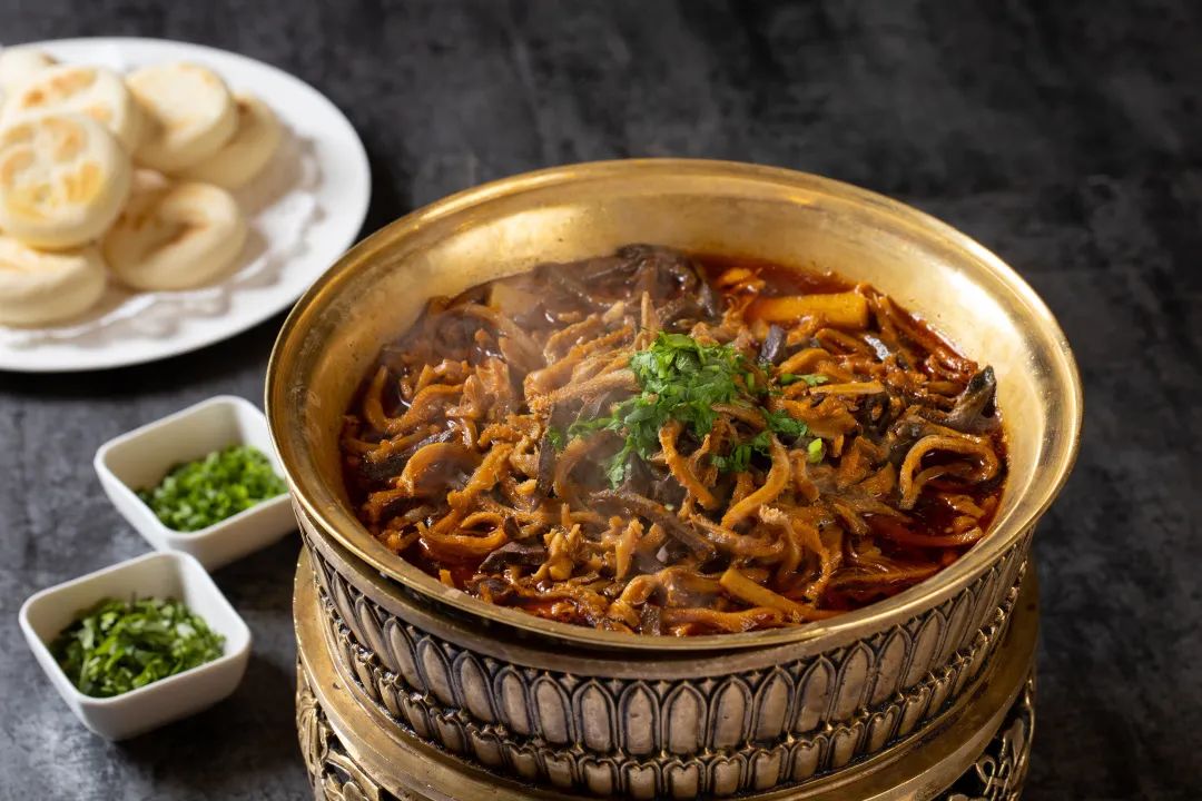 呼和浩特的大街小巷散落着无数个小门脸的羊杂碎铺,每天一大早,一碗羊杂碎,一个焙子,对于那些喜食羊杂碎的本地人来说,便是最惬意的早餐了。传统的羊杂碎用老汤熬制,放入切好的羊肺、羊肚、羊肠,越熬越香。羊杂充分吸收了老汤的味道,酥烂绵软,醇香味美。一碗上好的羊杂碎端上来,碗面上漂着一层透亮红油,冒尖一簇绿色香菜末儿,单从视觉诱惑就要垂涎欲滴了。配上刚出炉灶还热的烫手的白焙子或者牛舌饼,一口焙子就一口羊杂碎,再喝一口油汪汪的辣汤,冬天吃暖心暖胃,夏天吃痛快淋漓。