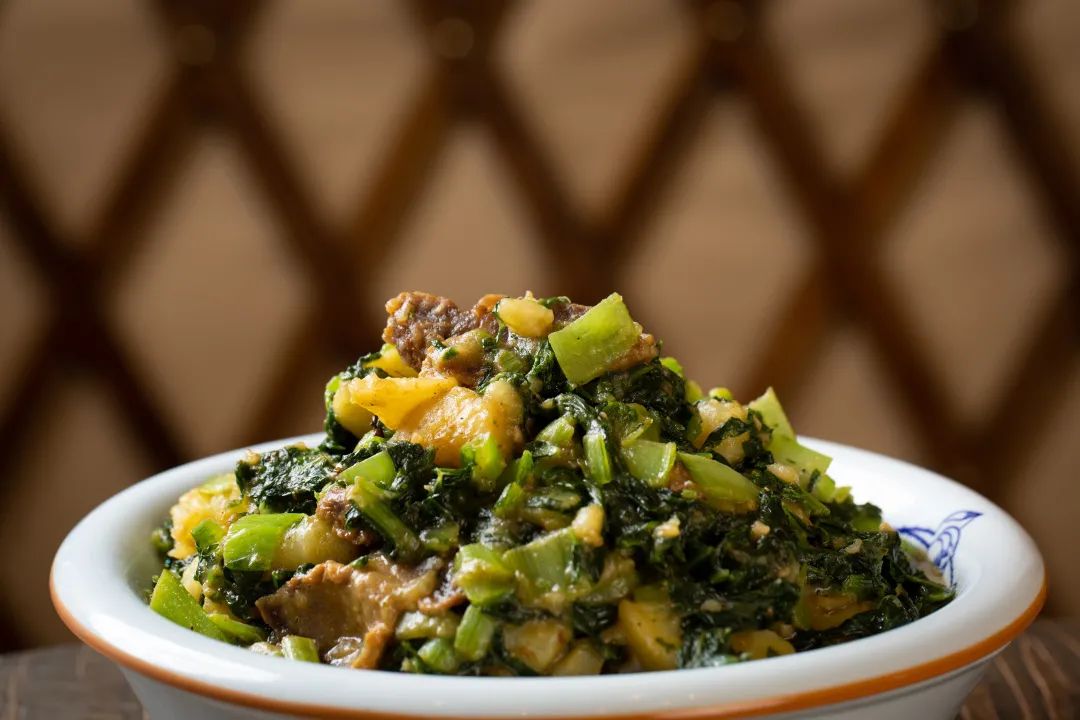 经过腌制的猪肉就像经历过风雨的岁月,万千滋味尽在其中。将猪肉切成一寸见方的块炒熟炒透,待肉块呈焦红色出锅冷却,在缸内将肉铺平后灌油贮藏。这种腌猪肉通常能贮存到来年秋冬季节。出缸后,与小白菜和土豆的约“烩”中,腌猪肉咸香浓郁,小白菜清香翠绿,在熟烂土豆的包裹下相得益彰,软糯醇香,是鄂尔多斯最日常的下饭菜。