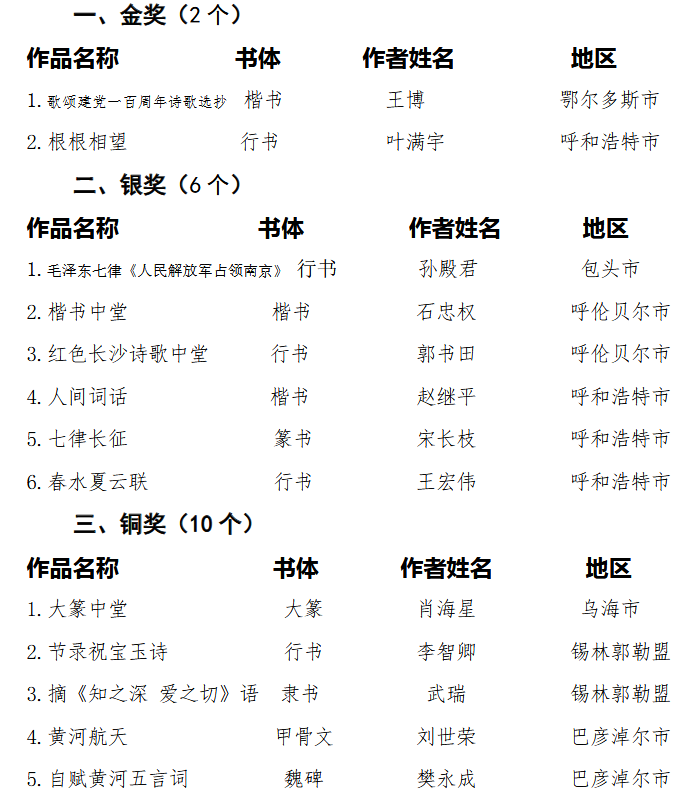 关于公布 “醉美草原,亮丽北疆”第二届全区书法作品展览获奖名单的通知