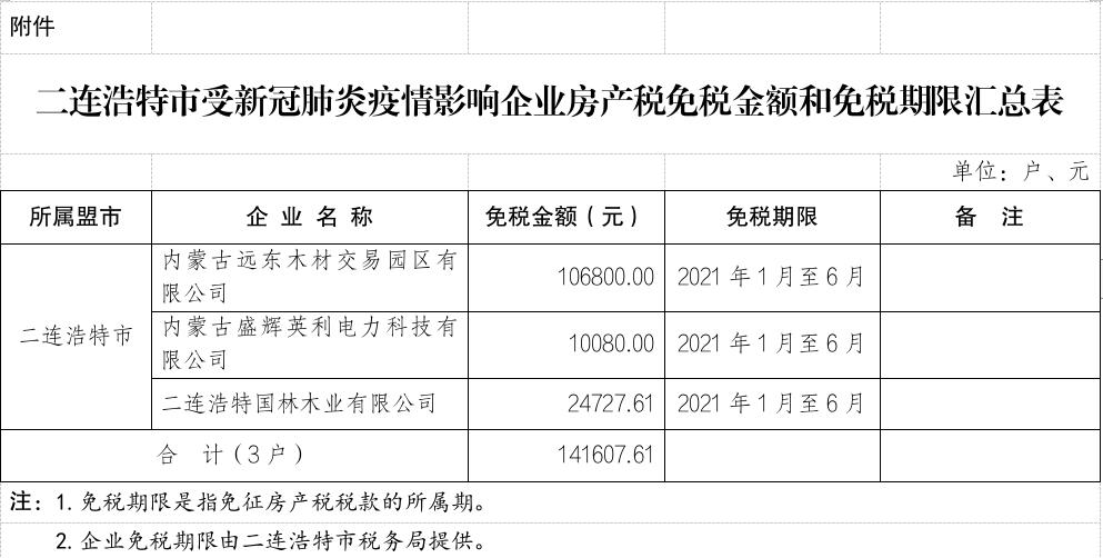 一、同意免征内蒙古远东木材交易园区有限公司等3户企业2021年1月至6月房产税141607.61元。具体免税企业名称、免税金额及免税期限见附件。