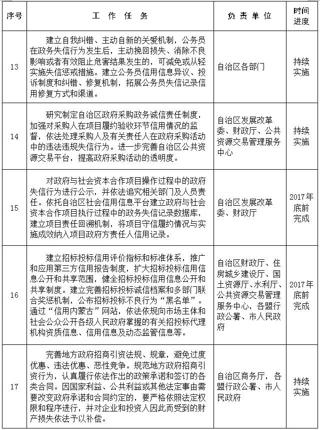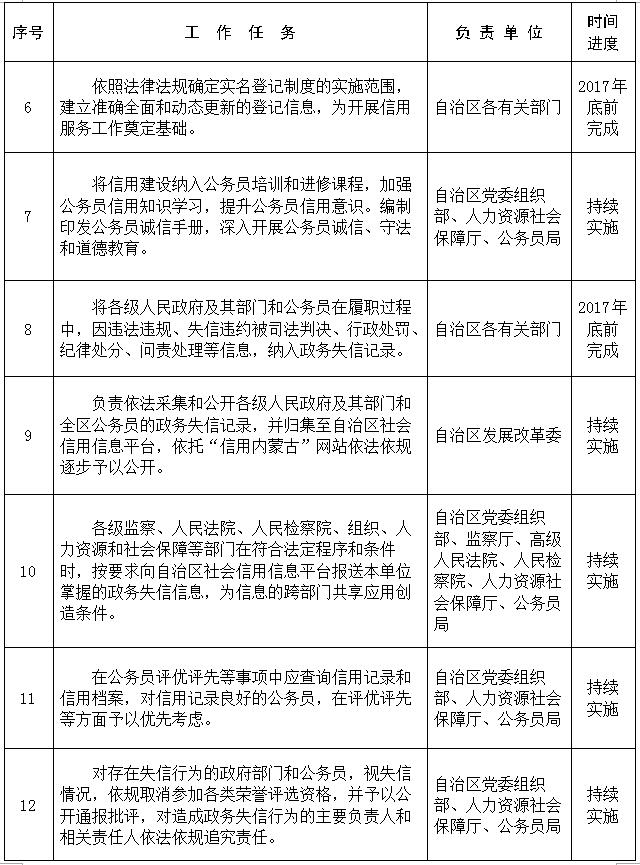 3.建立政务失信记录的归集机制。自治区发展改革委负责依法采集和公开各级人民政府及其部门和全区公务员的政务失信记录,并归集至自治区社会信用信息平台,依托“信用内蒙古”网站依法依规逐步予以公开。