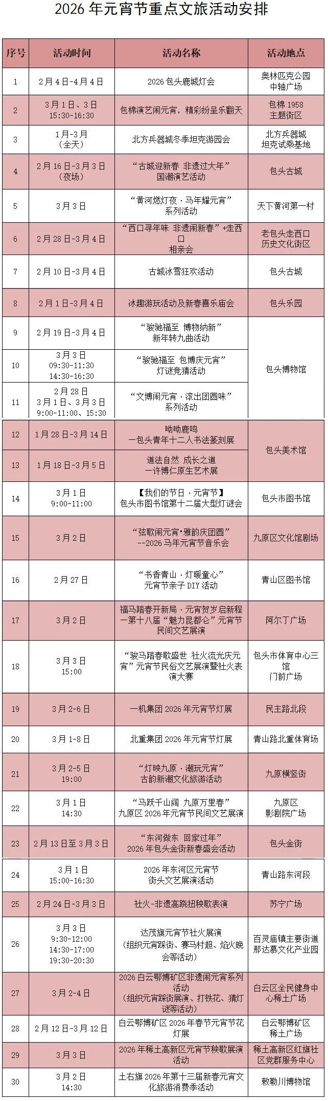 正月十五闹元宵,包头今年格外嗨!猜灯谜、赏花灯、品元宵……还有震撼的铁花非遗表演、热闹的街头高跷、精彩的民俗巡游!最具包头味的元宵节活动即将上演全家出游攻略请收好~哪里最好玩?几点开始?一篇给你盘点明白!一起红红火火过佳节活动名称:2026包头鹿城灯会活动时间:2月4日-4月4日活动地点:奥林匹克公园中轴广场活动介绍:引进“千灯夜”新派灯展IP,以非遗彩灯打造大型特色光影盛宴,融入鹿元素、工业文化等包头城市符号。融入文艺演出、文创潮品、非遗手作展销。活动名称:北方兵器城冬季坦克游园会活动时间:1月-3月全天活动地点:北方兵器城坦克试乘基地活动介绍:开展坦克试乘活动,同时搭配多元配套活动,打造兼具硬核体验与冬日温情的沉浸式游园盛宴。活动名称:“古城迎新春 非遗过大年”国潮演艺活动活动时间:2月16日-3月3日(夜场)活动地点:包头古城活动介绍:迎春非遗灯会,以“梦回敕勒川”为主题,结合剪纸、彩灯等非遗技艺,打造大型主题灯组;非遗打铁花+火壶表演;国潮沉浸演艺;限定烟花秀,夜场NPC互动。活动名称:“骏马踏春歌盛世 社火流光庆元宵”元宵节民俗文艺展演暨社火表演大赛活动时间:3月3日15:00活动地点:包头市体育中心三馆门前广场活动介绍:组织青山区辖区各街道、镇、区文化馆、一机集团、社会文艺团体等,举办青山区街头民间文艺汇演,表演形式以舞龙、舞狮、秧歌、高跷、腰鼓、大头娃娃、军乐等内容为主,充分展示我区传统文化和现代文化的魅力。活动名称:“福马踏春开新局·元宵贺岁启新程”昆都仑元宵节民间文艺展演活动时间:3月2日活动地点:阿尔丁广场活动介绍:融合国家级非遗英歌舞、街道特色民间文艺、马年主题互动场景,打造“展演+打卡+互动”三位一体的新春文化盛宴,彰显昆都仑区民俗魅力与城市活力,让市民在沉浸式体验中感受传统节日的文化底蕴与团圆氛围。活动名称:“骏驰福至 包博庆元宵”灯谜竞猜活动活动时间:3月3日9:30-11:30,14:30-16:30活动地点:包头博物馆活动介绍:通过猜灯谜了解包头西口文化、馆藏文物、元宵节习俗等知识。活动名称:社火-非遗高跷扭秧歌表演活动时间:2月24日-3月3日活动地点:苏宁广场活动介绍:高跷秧歌的表演中,气势恢宏的大场和轻快细腻的小场包括了音乐、舞蹈、杂技、戏曲等多种形式,构成以舞蹈为主体的综合性民间广场艺术。活动名称:呦呦鹿鸣—包头青年十二人书法篆刻展活动时间:1月28日-3月14日活动地点:包头美术馆活动介绍:展览聚焦青年创作群体,收录我市12位青年书法家创作的180幅精品力作。作品涵盖篆、隶、楷、草、行诸体,展现了当代包头青年书法家扎根生活、歌颂时代的创作风貌和青春活力。(具体活动内容请以现场为准)